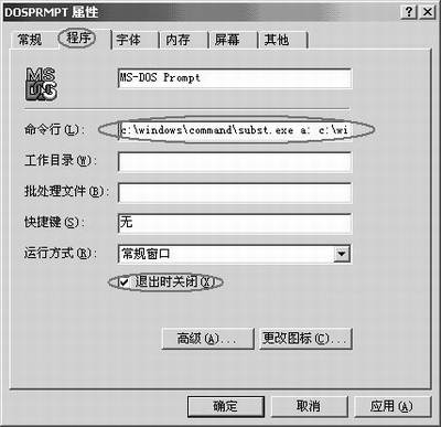 Windows Me:启动时并不读取Autoexec.bat,一旦发现Autoexec.bat有改动,马上用备份覆盖,所以采用在Windows 9X中使用的方法不行。我们可以利用启动组。具体操作是:在“我的电脑”或“资源管理器”中打开Windows Me的安装目录,如“c:\windows”。在文件“Dosprmpt.pif”上单击鼠标右键,选“复制”,然后鼠标依次单击“开始→ 程序”,在“启动”组单击鼠标右键,选“粘贴”。稍后,“启动”组中会出现“Dosprmpt.pif”,鼠标右键单击该文件,选“属性”,把命令行改为“c:\windows\command\subst.exe a: c:\windows\temp”,在“退出时关闭”前打钩(图1)。
