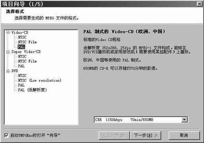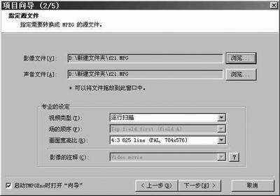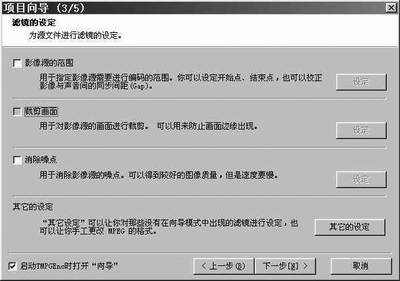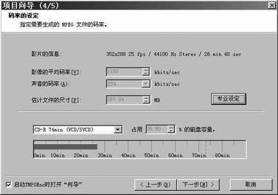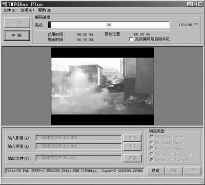 我下载的这款TMPGEnc PLUS软件版本为2.5,并下载了该软件的汉化包,用起来十分直观方便,运行该软件后即显示项目向导(见图1),从中选择Video-CD中的PAL格式,点击“下一步”,即会出现向导2(见图2),在影像文件中选“浏览”选择你要转换的视频文件,因为我们这里转换的文件本身就是有视频音频的MPEG格式,所以选影像文件后声音文件就不用再选了,然后点击“下一步”(见图3),在向导3中选择“裁剪画面”(见图4),到“裁剪画面”窗口后,选择“显示的设定”,在“显示方式”中选择“屏幕中心(自定义尺寸)”后调整下面的宽与高,将宽设定为352高设定为210即可,“确定”后,在向导3中点击“下一步”后到向导4(见图5),在此不用做任何设定,直接点击“下一步”到向导5(见图6),此为设置要生成的文件名及其路径,根据自己的需要设置即可,设完后“确定”,创建新文件后即开始合成(见图7),机器的配置不同生成的时间也不尽相同,但用现在主流的P4的机器,速度还是很快的。生成完后,原16:9的模式就转变成了4:3的遮幅模式了(即4:3的电影模式了),可以在普通彩电上正常播放了。