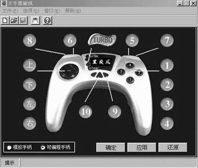 玩模拟器,笔者建议一定要购置一个手柄,这比用键盘打游戏要爽快多了。目前市场上手柄的品种繁多,价格从几元到数百元不等。我们需要选择的是仿PS型的数字编程手柄。至于接口类型,笔者建议除了打印机口不要选以外。其他方面则根据自己的需求和经济实力来决定。在购买时务必要试用一下,以按键弹性均匀、力量适中、无阻塞感、整体外观光滑者为佳。另外,品牌的选择也很重要。