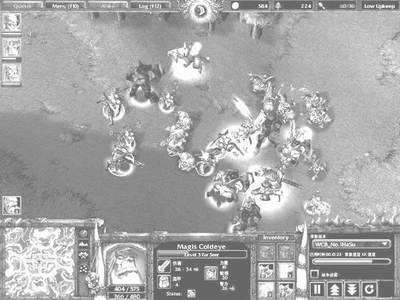 这时disgust还有5个骑士、3牧师、2步兵,并有两个狮鹫房在暴狮鹫,外加3级山丘和4级大法师,而wcb却有3个牛头人、4萨满、5巫医,另有一个4级剑圣、3级牛头人酋长和一个3级先知,但是由于他并没有开分矿,所以对于两片矿的人类来说有经济优势,而且刚才的突击中人类摧毁orc的3个地洞使得orc的人口为60/30。虽然orc占了暂时的兵力优势,但是如果打持久战却对他不利,所以wcb在用镜像杖复制了3个牛头人后纠集所有的部队冲向人类的基地。这时造在分矿口的农场起到了重要的侦察和拖延敌人攻击的作用。大法师马上去商店抢了两个治疗卷轴,打算截住wcb的队尾。disgust将骑士横向拉开绕道去围对方的先知,wcb马上将先知往后拉并且快速的调整阵形,如图3。大法师马上使用亡灵之书补充兵力,在混战中disgust的山丘发挥了极大的作用使用雷霆一击,降低orc部队的作战能力,而大法师则用暴风雪猛砸对手的萨满,最后先知在山丘的风暴之锤和骑士的猛攻下终于成佛升天回祭台了。