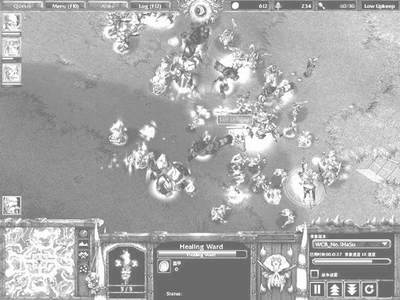 看到对方冲上高坡后,wcb的剑圣在抢购了几个血瓶后立即使用回城卷。可是wcb犯了一个低级失误──由于在购物时他的剑圣和部队距离太远,所以这个回城只有剑圣一个人被传了回去。wcb马上以极快地反应将牛头人和基地中仅有的几个萨满拉离一线战场,保存有限力量,躲在地堡后面攻击敌人。而牛头在再加了嗜血后配合剑圣绕道人类后方,攻击没有骑士保护的法师,如图2。