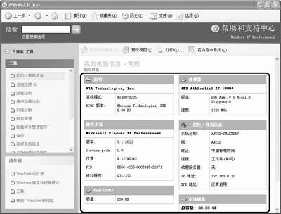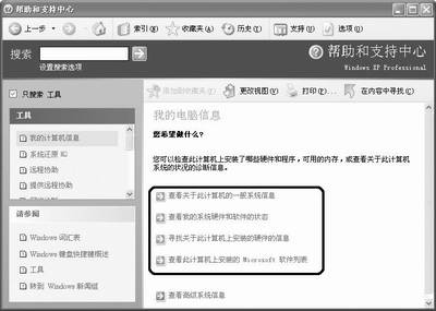 在Windows XP中,为了方便初学者,我们可以通过“帮助和支持中心”来更直接地使用“系统信息”工具。首先,我们可以在“开始”菜单中选择“帮助和支持”来进入“帮助和支持中心”。在该窗口的“选择一个任务”下点击“使用工具查看您的计算机信息并分析问题”项,在以后的窗口中会列出Windows XP中几乎所有的工具,其中涉及系统信息的有两项:“我的计算机信息”和“高级系统信息”工具(初学者对后者只需了解即可)。