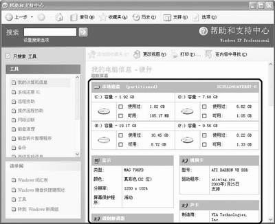 3.“寻找关于此计算机上安装的硬件的信息”项,我们可以获得本地硬盘各分区的使用情况,显示器类型、颜色、分辨率信息,视频卡(显卡)、声卡、调制解调器、网卡和USB控制器的制造商、型号和驱动程序信息,如图3所示。这里囊括了硬件设备信息;