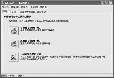 在高级模式窗口的“欢迎”标签选项中,通过“备份向导(高级)”按钮可以完成对文件的备份(包括计算机上所有的文件和文件夹、指定的文件或文件夹、系统状态的数据);通过“还原向导(高级)”按钮可以从已经创建好的备份文件中还原它们;这里的“自动系统恢复向导”相当于向导模式中的备份“这台计算机上的所有信息”。另外在高级模式窗口中还多了一个“计划作业”功能(即可以按计划的时间进行自动备份)。