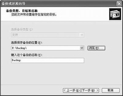 在这个窗口中,选中“我的文档和设置”,点击“下一步”,接着,在图7所示的窗口中我们就可以选择备份文件保存的位置,默认的是软盘(A:),通过“浏览”按钮我们可以选择其他的位置(比如硬盘的某个文件夹,你可以事先新建一个专门保存备份文件的文件夹)。点击“浏览”按钮后往往会弹出一个要求“插入磁盘”的窗口,这时你可能会问:那是不是非要插入软盘啊?不是的,在选择“取消”之后就可以选择其他的保存位置。另外,在窗口的“键入这个备份的名称”下面我们可以输入备份文件的名称,当然你可以使用默认的名称(Backup),不过为了区别不同的备份文件,建议最好输入一个自己一看就明白的名字。