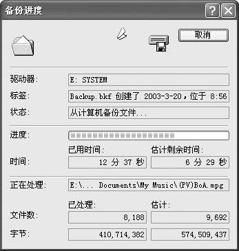 再点击“下一步”,出现图8所示的窗口,在这里我们可以点击“高级”按钮来选择备份类型,我们不必去管它,使用默认的就行了,最后点击“完成”按钮就可以进行备份了。这个时候,备份工具会收集要备份文件的内容和大小,我们还会看到图9所示的备份进度窗口,备份完毕后还会列出一些信息。