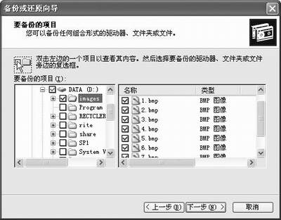 选中“让我选择要备份的内容”复选框之后,点击“下一步”,在出现的窗口中我们可以自己选择要备份的具体文件(或文件夹),比如要备份D:盘images文件中所有的文件。我们可以在左侧的窗口中选择,选中之后在“images”文件夹上就会出现一个“√”标记,双击任何一个磁盘驱动器(比如C:、D:)或文件夹都会将其中的内容以列表的形式显示在右侧的窗口中(如图10所示),在右侧的窗口中我们还可以进行更详细的选择。选择好了,点击“下一步”,再选择备份文件保存的位置和名称后,再点击“下一步”,接着点击“完成”就可以对指定的文件(或文件夹)进行备份。当然在这里也可以指定对“我的文档”进行备份。