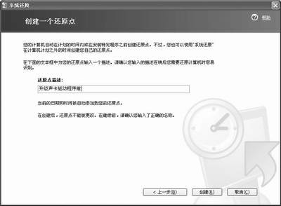 我们可以通过“开始→所有程序→附件→系统工具→系统还原”命令来打开系统还原向导(如图11所示),选中“创建一个还原点”,然后单击“下一步”,在出现的窗口中,我们可以在“还原点描述”文本框中输入还原点的描述信息,以便于在还原计算机时容易识别,比如我在升级声卡驱动程序之前,为了防止意外,我创建了一个名为“升级声卡驱动程序前”的还原点(如图12所示)。最后,单击“创建”按钮,在过一小会儿后,就可以完成系统还原点的创建,而且当前的日期和时间将被自动添加到创建的还原点中。不过,在创建后,还原点的名字(描述)是不能被更改的。如果还要执行其他的任务,在这里可以单击“主页”按钮回到系统还原向导主窗口。