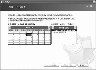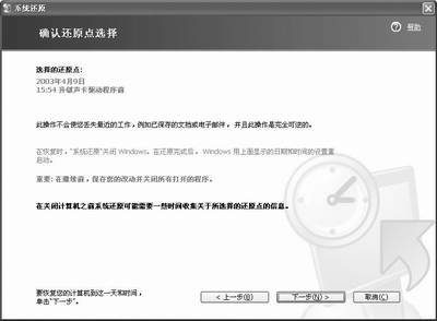 同样,我们打开系统还原向导,在该窗口中,选中“恢复我的计算机到一个较早的时间”,再单击“下一步”,会进入图13所示的窗口,在窗口左侧的日历中会以黑色字体显示已创建还原点的日期,点击该日期,就会在右侧的列表中显示所有的还原点信息,包括系统自动创建的还原点(系统检查点)、我们手工创建的还原点以及在安装程序时创建的还原点,选择一个还原点,单击“下一步”,马上会出现一个确认还原点选择窗口(如图14所示)。如果你确认进行还原的话,再单击“下一步”就行了,这时系统会先注销,之后会出现一个系统还原进程窗口,再过一段时间后,系统会自动重新启动,这样就完成了系统的恢复。