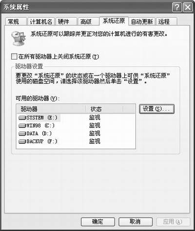 在默认的状态下,系统还原对所有驱动器中的系统文件或应用程序文件的更改都是处在被“监视”状态下的,虽然可以保证全面监视,但是它是以消耗硬盘空间为代价的(最大使用硬盘12%或400MB的空间),在每个驱动器中安装应用程序,或者进行其他的修改都会被系统还原“记录在案”,保存到硬盘的特定隐藏目录中。这样随着时间的增长,你会发现硬盘空间越来越小。