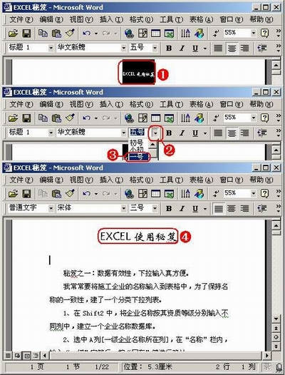 ①选中需要设置字号的文本。②单击“字号”右侧的下拉按钮。③在随后弹出的字号列表中,选择需要的字号。④选中的文本即被设置为相应的字号。