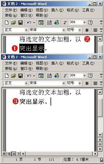 ①选中需要加粗的文本。②单击“加粗”按钮。③选中的文本被加粗显示出来。