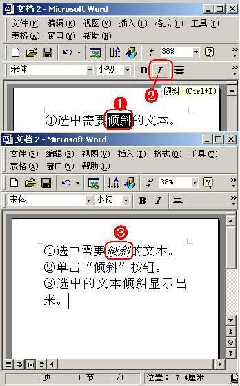 ①选中需要倾斜的文本。②单击“倾斜”按钮。③选中的文本倾斜显示出来。