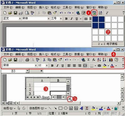 ①将光标定在需要插入电子表格的位置,单击“插入Microsoft Excel工作表”按钮。②在随后弹出的表格定制框中,按住鼠标左键不放,拖拉一下,松开鼠标。③一个Excel电子表格被插入到文档中。④此时Word的“常用”和“格式”工具栏被换成了Excel中的“常用”和“格式”工具栏了。⑤如果觉得显示出来的表格区域太小,影响操作,可以将光标移至表格右下角(或左边框、下边框处)成双向箭头时,按住左键拖拉,即可调整表格显示区域的大小。