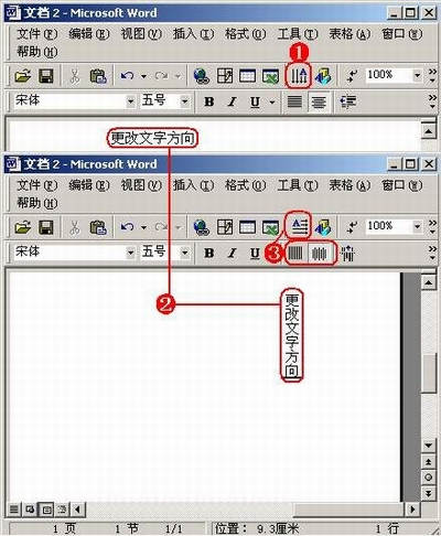 ①单击“更改文字方向”按钮。②整个文档中文字的显示方向被改变。③工具栏上某些按钮也智能化地发生了改变。