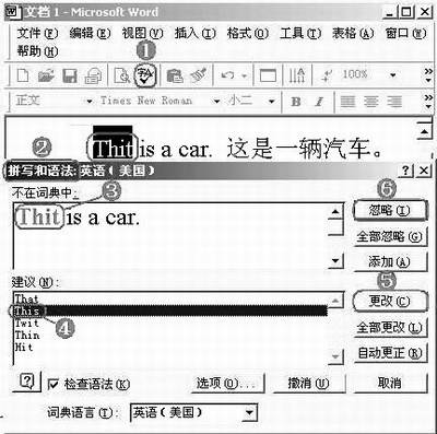 ①文档录入完成后,单击“拼写和语法”按钮。②如果文档中有拼写或语法错误,系统会弹出“拼写和语法”对话框。③同时选中文档中第1个错误处,并在对话框中以红色突出显示出来。④在“建议”下面的方框中,选择一个正确的词汇。⑤单击“更改”按钮进行更正。⑥如果你认为此处没有错误或需要这种错误(如给学生出练习题时),可以单击“忽略”按钮跳过。