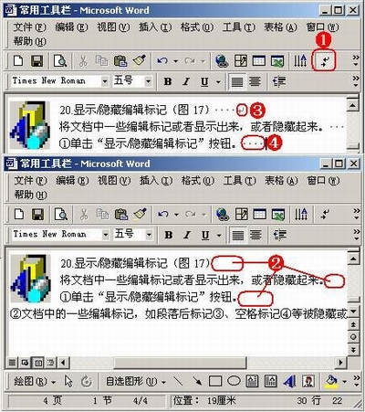 ①单击“显示/隐藏编辑标记”按钮。②文档中的一些编辑标记,如段落后标记③、空格标记④等标记被隐藏或显示出来。