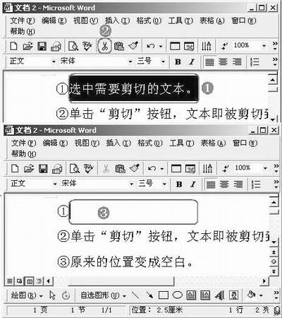 ①选中需要剪切的对象(文本)。②单击“剪切”按钮,文本即被剪切到“剪贴板”中。③原来的位置变成空白。