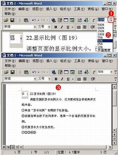 ①单击“显示比例”右侧的下拉按钮。②在随后弹出的下拉列表中,选择一个合适的页面显示比例。③页面显示大小发生改变。
