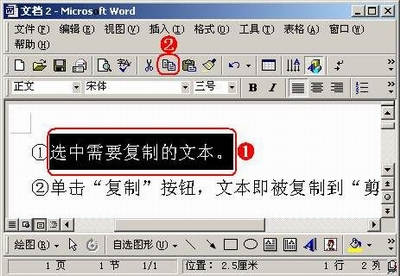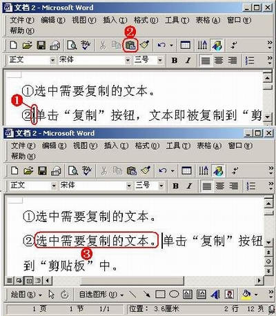 ①选中需要复制的对象(文本)。②单击“复制”按钮,文本即被复制到“剪贴板”中,被复制的文本仍然保持在原来的位置上。