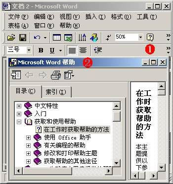 ①单击“Microsoft Word帮助”按钮。②启动Word帮助窗口,查看有关操作的详细说明。