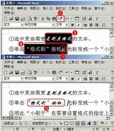①选定某些需要复制其格式的文本。②单击“格式刷”按钮。③光标变成一个“小刷子”状。④用此“小刷子”在需要设置格式的指定文本上拖拉。⑤选定文本的格式就被复制到拖拉过的文本上了。
