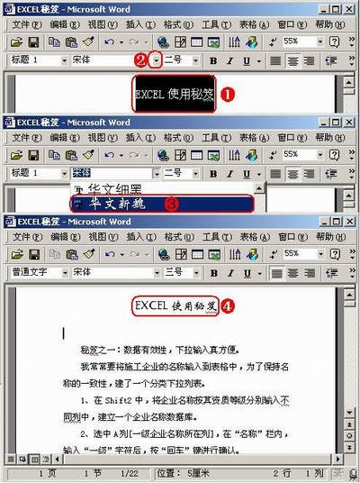 ①选中需要设置字体的文本。②单击“字体”右侧的下拉按钮。③在随后弹出的字体列表中,选中需要的字体类型。④选中的文本被设置为相应的字体。