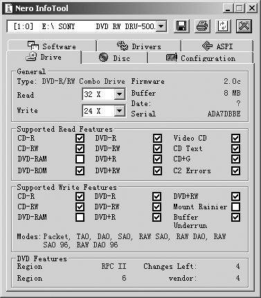 SONY DRU-500AX可以兼容多种盘片格式,我们用Nero的InfoTool来看看它兼容哪些盘片(图2)──21个项目中它支持18种,市面上常见的盘片都可以喂给它吃了!最为关键的是:它同时兼容DVD+RW/DVD-RW两种标准。表1中列出了它对CD盘片和DVD盘片的最大读写速度。DRU-500AX带有8MB的缓存,并具有Power-Burn防刻死功能。