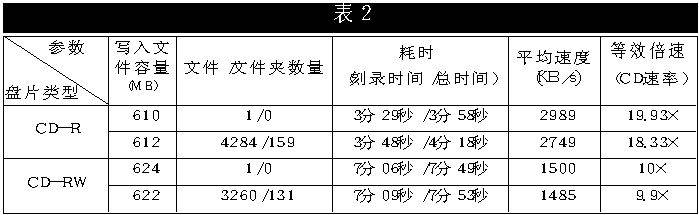 实测结果见表2。首次写入610MB的单个数据文件,耗时3分58秒,其中29秒是关闭盘片的时间,单纯刻录时间为3分29秒,平均速度为2989KB/s,约为20×(CD-ROM的1×为150KB/s),略低于模拟测试的结果21.68×,不过也相差无几了。