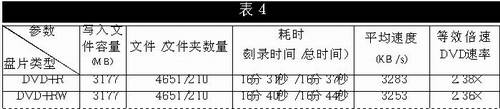 DRU-500AX支持4×写DVD-R盘片,2×写DVD-RW盘片,但市面上只能找到2×的DVD-R盘片和1×的DVD-RW盘片。测试结果见表3。