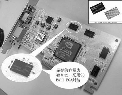 市场上300元到600元之间的显卡层出不穷,而GeForce4 MX440SE可以说是出货量最大、最超值的一款,价格便宜性能又好,一般只要400元左右就可以买到。不过在购买GeForce4 MX440SE的时候一定要注意了,为了拼价格,JS厂家耍的花样还真不少,首先是在核心和显存类型、频率上做文章,本来应该使用128bit DDR的显存但他们使用了128bit的SDRAM或者是64bit的DDR;本来标准是166MHz的DDR(等效频率333MHz,显存应该为6ns的型号),他们使用了更低频率的显存,比如8ns或者规格更低,核心频率本来应该是250MHz而实际产品只有200MHz左右,以上都是一些“常规”的缩水手段。最近小编在市场中看到一种更“高明”的手法,用少见的BGA封装的SDRAM来冒充DDR显存(见图)。