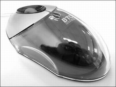 然后是这款漂亮的透明鼠标(图2)。这是BTC出品的M830光电鼠标,通体透明,搭配红色的底板,显得十分漂亮,外形也设计得比较合适,只是扫描频率低了点,快速移动中有跟踪失败现象,不过我们本来就是图个好看嘛。报价92元,比较便宜。