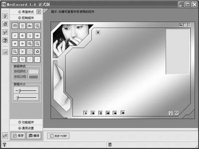 从图1中可以看到,这里所有的功能都是以按钮的形式提供,看不到通常所见的菜单。最左侧的几个按钮分别是关于、主页、邮件、帮助、背景设置等功能键。而对用户来说最重要的还是界面样式、控制组件、功能组件、通用设置四个工具条,点击后会看到更为详尽的功能按钮及参数设置,右方为编辑区域,最底部分别是打开、保存、编译、EXE→SWF等按钮,反正都是中文,看起来一目了然。