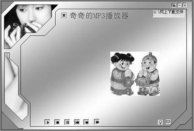 这一步其实并不重要,主要用来添加一些注释文本、插入图片、GIF动画等,有什么图片的话,就赶快插入吧。由于这里是做一个MP3播放器,奇奇就写了“奇奇的MP3播放器”这么一句话,还将自己的一幅图片插了进来。注意插入图片时必须先点击左侧的“图片1”等按钮,然后利用十字光标在播放界面上画出一个图片区,再从右键菜单中选择“导入图片”命令。如图2所示,看起来非常神气呀。