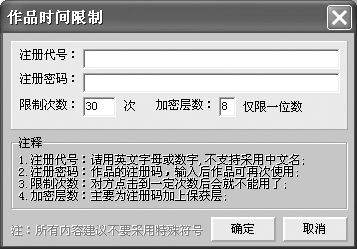 奇奇提醒:这里有一个非常实用的功能,那就是“注册限制”按钮。该按钮添加后可以使你的多媒体作品具有注册代号、注册密码、限制次数、加密层数(为注册码加上保护层,这样别人就不容易破解了),如图3所示,大家觉得如何?