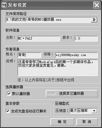 不过,为了将这个MP3播放器打包成可执行文件,奇奇还需要进行编译。点击“编译”按钮,这时弹出了一个图5所示的对话框,奇奇决定将这个播放器暂时放到“我的文档”下,至于作品信息嘛,就用“奇奇的MP3播放器”就行了,最后再一次去点击“确定”按钮就OK了。