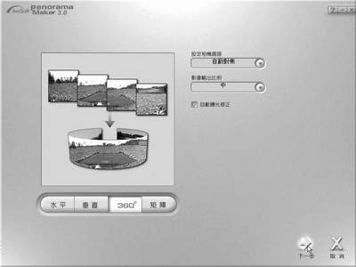 在主界面单击“建立新档”按钮会弹出一个选择窗口,全景大师提供了“垂直”、“水平”、“360度环场”及“矩阵”四种全景模式,能满足我们不同素材的要求。例如你准备的图片是摩天大厦或瀑布之类的图片,选择“垂直”模式做出的全景效果会非常棒。这里我们选择的是最具临场感的“360度”环场全景类型(图2),选择后点击“下一步”继续。
