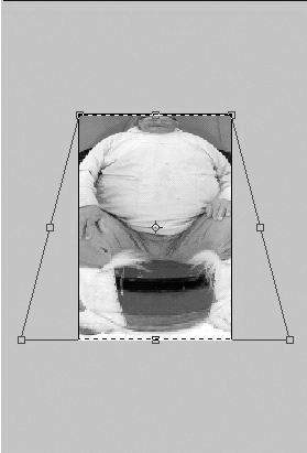 此外,还可用“编辑→变形→缩放”命令夸张人的身材(图4),可将人变成巨人,也可将人变成侏儒(图5)。再配合选区与图层操作,还可将人的局部,如头、手、脚、身子单独进行夸张处理,得到更多意想不到的幽默的人体变形画面。
