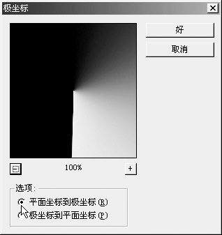 3.取消选区,打开滤镜菜单,选择扭曲滤镜中的极坐标滤镜,设置为平面坐标到极坐标,为图形做平面坐标到极坐标的扭曲效果,如图2。