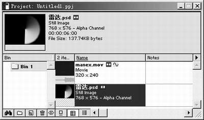 1.打开Premiere 6.5,选择菜单命令“File→Import”,导入刚才在Photoshop中做的“雷达.psd”和在网上下载的一段视频“manex.mov”(quicktime格式),如图4。