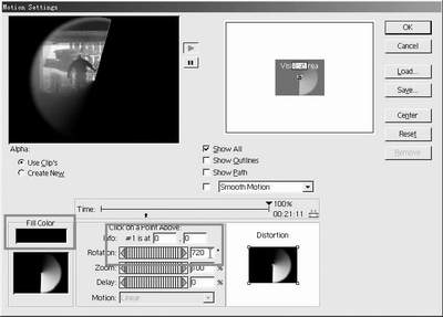 4.选中video2视轨,选择菜单命令“Clip→Video Options→Motion”项,弹出对话框,设置Star和End的位置是0,Rotation为720,Fill Color为黑色,如图6。