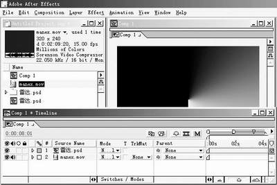 4.选择菜单命令“File→Import→File”,导入素材 “雷达.psd”和“manex.mov”。当然AE里也可以在做“雷达.psd”,不过既然有现成的,还是直接拿来用方便。把项目窗口中的“雷达.psd”和“manex.mov”先后拖到时间线上,如图7。