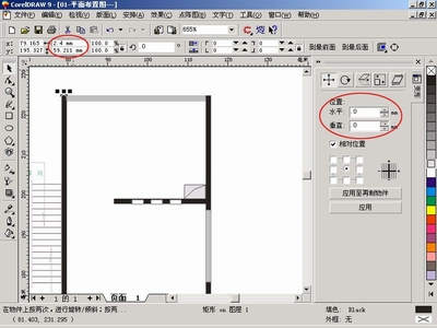 在Corel DRAW中,用矩形工具画出墙基线、立柱、横梁,用“安排→变形→大小”命令,按比例改变尺寸大小,墙厚为1/2墙(12cm)、1.8墙(18cm)、2.4墙(24cm),室内开间为墙长度(矩形长度)。直接在输入框内输入参数(图1)。用鼠标左键在色盘点选需要填充的彩色(一般墙基线为黑色)。选中需要复制的对象(墙基线、立柱、横梁),按键盘上的“+”号复制一个物体对象。用“安排→变形→位置”命令,改变墙基线的距离和位置即室内开间(常规为2.2m、2.4m、3.3m、3.6m、4.2m、)。用“安排→变形→旋转”命令,改变墙基线的角度和方向。