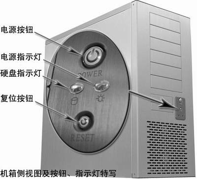 机箱最前面的是“前面板”,如果你仔细观察还会在前面板上找到电源开关、复位开关等两个按钮,另外还有电源指示灯、硬盘工作指示灯这两个指示灯(图1)。
