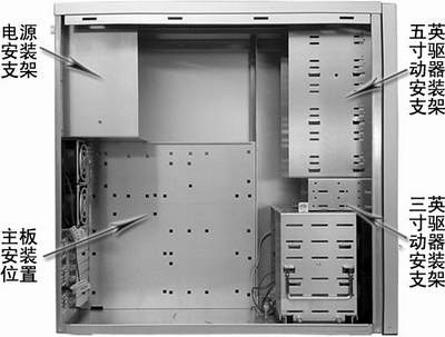机箱左上角的那个安装支架是用来安装电源的,在它的下方是用来安装主板的;机箱的右上角共有若干个与机箱同样宽度的安装支架,这就是5英寸驱动器支架,用来安装光驱、刻录机等5英寸设备;在5英寸驱动器支架的下方,则是若干个较窄的驱动器支架,这是3英寸驱动器支架,用来安装硬盘、软驱等3英寸设备。