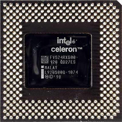 1998年,Intel为抢占低端市场推出了Celeron(赛扬)处理器,去掉了PⅡ的二级缓存,新的赛扬处理器采用了0.35μm工艺制造,外频为66MHz,主频有266MHz与300MHz两款。由于抽掉了L2 Cache,赛扬处理器的整数性能大打折扣。于是,Intel随机应变,又推出了集成128KB二级缓存的Celeron,频率从300MHz到566MHz,命名为Celeron XXXA,采用了Socket370插座,集成的二级缓存容量只有128KB。不过,这款CPU的超频性能非常好,300MHz主频的赛扬可以轻松超到450MHz。