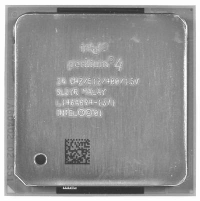 在Intel正式发布533MHz前端总线的Pentium4处理器不久,便发布了P4赛扬处理器。P4赛扬的频率从1.7GHz起步,初期的产品沿用了原来的P4 Willamette核心,前端总线只有400MHz,而后期的产品都采用了533MHz前端总线的Northwood核心。P4赛扬处理器上明确标有Celeron字样,并且可以很清楚看到128KB二级缓存和400MHz的前端总线,核心电压为1.75V。从CPU背面可以看到,P4赛扬的针脚和旧核心的P4没什么两样,可以和P4 CPU互换。