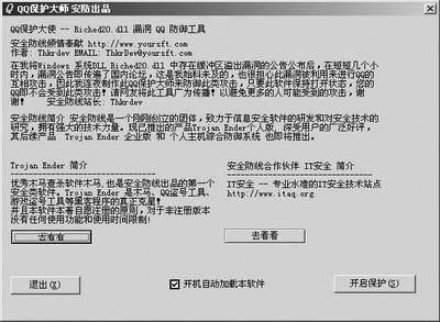 木马入侵电脑,很容易盗取我们的私人信息,如何才能够防止这样的木马在我们的电脑中搞破坏呢?启动反黑精英之后,执行QQ保护大师,得到如图1的对话框。只要执行了启动保护命令,就会对我们的QQ起保护作用,这时软件会自动扫描木马。一旦电脑中存在了木马程序,软件会自动对这些木马进行清除或者是抵抗,使这些木马无法起作用,也就不能获取我们的QQ密码了。