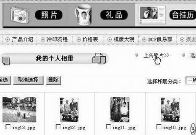 单击“我的个人相册”开始上传照片,如图3。单击“上传照片”。(小经验:在开始上传照片前,我们最好先把要冲洗的照片存放在一个文件夹里如“mypicture”,这样可以方便查找和节约时间。另外由于网站只支持JPG格式文件,所以请先用工具软件将文件转化为JPG格式。且大小限制在3MB以内,3MB以上的需联系管理员另外上传。)注意:虽然网站最多允许同时上传五张照片,但是据我的经历,对于拨号上网用户将会是漫长的等待,建议一张一张上传。选定照片后,单击“提交”,如图4。