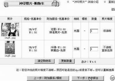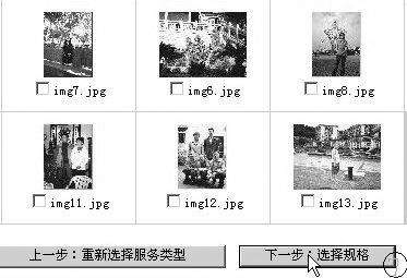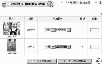 如我选的是img4.jpg和img9.jpg,单击“下一步”。在图8中,我们可以选择规格、数量、相纸等。注意:像素不同的相机,所拍出的照片要冲洗出最好的效果的话,必须选择相应的尺寸。具体可参考2003年第6期E4版《数码照片冲印ABC》一文。